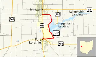 State Route 362 (SR 362) is a 4.56-mile (7.34 km) north–south state highway in the western part of the U.S. state of Ohio. It serves to connect Lake Loramie State Park with SR 66. Its southern terminus is in Fort Loramie at the intersection of North Main Street (SR 66) and Elm Street. near the northern edge of Fort Loramie. SR 362 then runs about 1.1 miles (1.8 km) east, then turns north at its intersection with Fort Loramie–Swanders Road (which continues east). SR 362 then runs northerly along the western edge of Lake Loramie and Lake Loramie State Park before turning northwesterly then westerly and enters Minster and reaches its northern terminus at the intersection of South Main Street (SR 66) and First Street.
