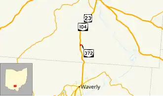 State Route 372 (SR 372) is a very short, two-lane east–west state highway in the southern part of the U.S. state of Ohio. The western terminus of this spur route is at a T-intersection with the concurrency of U.S. Route 23 (US 23) and SR 104 about six and a half miles (10.5 km) north of Waverly. Its eastern terminus is just 0.68 miles (1.09 km) to the east of that point at the boundary of Scioto Trail State Forest. Continuing east of that point is Stoney Creek Road, which traverses through the state forest in the direction of the Scioto River. From its inception in the middle of the 1930s, the primary function of SR 372 has been to provide access to the state forest from the state highway system.