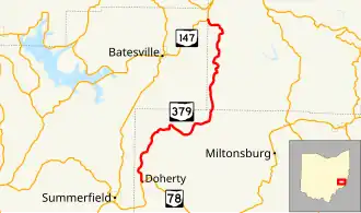 State Route 379 (SR 379, OH 379) is a north–south state highway located in the southeastern quadrant of the U.S. state of Ohio. The highway runs from its southern terminus at a T-intersection with State Route 78 nearly 3.25 miles (5.23 km) northeast of Summerfield to its northern terminus at a Y-intersection with State Route 147 about 3.75 miles (6.04 km) northeast of Batesville on the Noble-Belmont County Line.