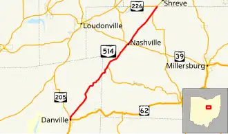 State Route 514 (SR 514) is a state highway in Knox and Holmes Counties in central Ohio. 19.89 miles (32.01 km) long, it connects US 62 and the southern terminus of SR 205 in Danville to SR 226 in the community of Centerville just south of Shreve.