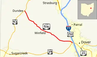 State Route 516 (SR 516) is a two-lane east-west state highway that runs entirely within Tuscarawas County in eastern Ohio. The western terminus of State Route 516 is at State Route 93 in Dundee. Its eastern terminus is at a signalized intersection with State Route 39 in Dover, just one block west of the Interstate 77/U.S. Route 250 freeway.