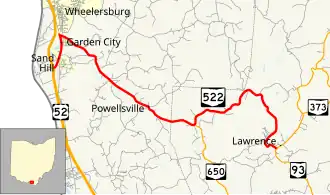 State Route 522 (SR 522) is an east–west state highway in the southern portion of the U.S. state of Ohio. State Route 522 has its western terminus is at a diamond interchange with U.S. Route 52 less than 3 miles (4.8 km) south of Wheelersburg. Its eastern terminus is at a T-intersection with State Route 93 just over 9 miles (14 km) north of Ironton.