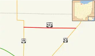 Ohio State Route 523 (OH 523) is a state highway in North Central Ohio. A short connector route, OH 523 links OH 19 at its western terminus with OH 53 at its eastern terminus. OH 523's intersection with OH 53 is located less than 4 miles (6.4 km) northeast of the OH 53 exit off of I-80/I-90/Ohio Turnpike.