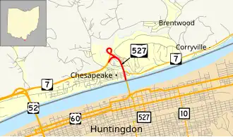 State Route 527 (SR 527) is a north–south state highway in the southern portion of the U.S. state of Ohio. Its southern terminus is at the Ohio River in Chesapeake, where the Robert C. Byrd Bridge carries travelers across to Huntington, West Virginia. Its northern terminus is at State Route 7 at the partially completed Chesapeake bypass just northeast of the Chesapeake corporation limits. SR 527 is one of the few state routes in Ohio that connects to the same numbered route in a neighboring state, becoming West Virginia Route 527.