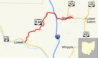 State Route 530 (SR 530) is a nearly 8-mile (13 km) long, east-west state highway in the southeastern corner of the U.S. state of Ohio. The western terminus of State Route 530 is at a signalized T-intersection with State Route 60 in downtown Lowell. Its eastern terminus is at State Route 821 in the community of Warner, nearly 1 mile (1.6 km) west of Lower Salem.