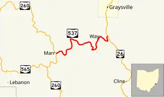 State Route 537 (SR 537) is a short east–west state highway in southeastern Ohio. At a length of just shy of five miles (8.0 km), SR 537 is located entirely within southwestern Monroe County. The state route's western terminus is at SR 260 approximately three and a half miles (5.6 km) southeast of the unincorporated community of Sycamore Valley, and its eastern terminus is at SR 26 one mile (1.6 km) south of the village limits of Graysville.