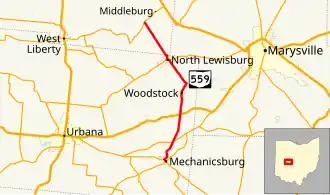 State Route 559 (SR 559) is a north–south state highway in the central portion of the U.S. state of Ohio. The southern terminus of the highway is at the signalized junction of State Route 29 and State Route 4 in downtown Mechanicsburg. Its northern terminus is at a T-intersection with State Route 287 approximately 4 miles (6.4 km) northwest of North Lewisburg.