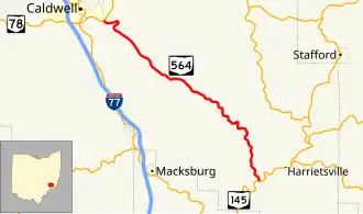 State Route 564 (SR 564) is a 13.48-mile-long (21.69 km) state highway in Noble County, Ohio, USA. The signed east–west route, though physically more northwest–southeast, begins at SR 78 on the outskirts of Caldwell and ends at SR 145 in Jefferson Township.
