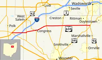 State Route 604 (SR 604) is an east–west state highway in north central Ohio. The western terminus of SR 604 is at a T-intersection with US 42 in Jackson Township approximately 5 miles (8.0 km) southwest of West Salem. Its eastern terminus is at the intersection that doubles as the southern split of the concurrency of SR 94 and SR 585 in Chippewa Township nearly 1.5 miles (2.4 km) southeast of Rittman.
