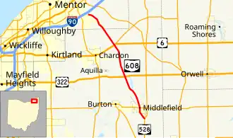 State Route 608 (SR 608) is a north–south state highway in the northeastern portion of the U.S. state of Ohio. Its southern terminus is at State Route 528 about 2 miles (3.2 km) south of Middlefield. The northern terminus is at Ravenna Road (Lake County Road 360, former State Route 44) about 4 miles (6.4 km) south of Painesville. The route passes through one of the largest Amish settlements in Ohio; an Amish-run cheese factory is located at Nauvoo Road north of Middlefield.