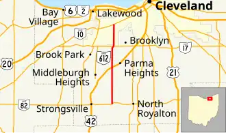 SR 612 traveled on what is now West 130th Street in western Cuyahoga County. The route began at SR 82 on the Strongsville–North Royalton line. It continued northward, traversing along the borders of Stongsville, North Royalton, Middleburg Heights, Parma, Brook Park, and Parma Heights, before intersecting SR 17 on the border of Cleveland and Parma. The highway continued further north to SR 10 in Cleveland, where it terminated.[3]