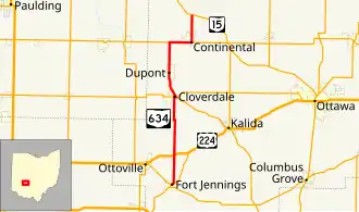 State Route 634 (SR 634) is a 17.95-mile-long (28.89 km) state highway in the northwestern portion of the U.S. state of Ohio. The highway runs from its southern terminus at its junction with SR 189 and SR 190 in Fort Jennings to its northern terminus at the intersection of SR 15 nearly 1.5 miles (2.4 km) north of Continental. SR 634 runs entirely within Putnam County and is entirely a two-lane highway.