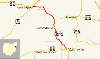 State Route 644 (SR 644) is a north–south state highway running through Columbiana and Carroll counties in northeast Ohio. Its southern terminus is at SR 39 in downtown Salineville, and its northern terminus is at its junction with U.S. Route 30(US 30) and SR 9 in the center of Kensington. The route connects mainly rural and a few unincorporated parts of southeastern Columbiana County. SR 644 only briefly passes into a corner of Carroll County for a 0.41-mile (0.66 km) journey.