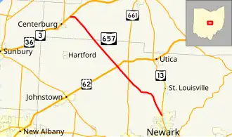 State Route 657 (SR 657) is a state highway in central Ohio, a U.S. state. While signed as a north–south route, State Route 657 actually travels in a northwest–southeast fashion. The southern terminus of the route is at a T-intersection with SR 13 immediately north of the city limits of Newark. Its northern terminus is at a T-intersection with the concurrency of US 36 and SR 3 about 1 mile (1.6 km) northeast of Centerburg.
