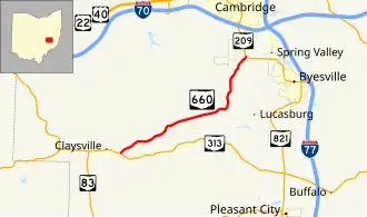 State Route 660 (SR 660) is an east–west state highway in the east-central portion of Ohio. Existing entirely within Guernsey County, the western terminus of State Route 660 is at State Route 313 just east of the hamlet of Claysville. Its eastern terminus is at a signalized T-intersection with State Route 209 near Cambridge Municipal Airport, 1.25 miles (2.01 km) south of the city limits of Cambridge, as well as State Route 209's interchange off of Interstate 70.