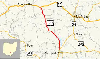 State Route 683 (SR 683) is a north–south state highway in the southern portion of the U.S. state of Ohio. The southern terminus of State Route 683 is at a T-intersection with State Route 93 about 0.50 miles (0.80 km) north of Hamden. Its northern terminus is also at a T-intersection, this time with U.S. Route 50 nearly 6 miles (9.7 km) west of McArthur.