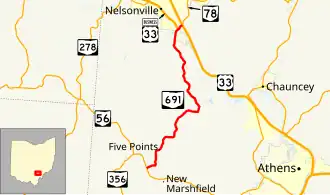 Ohio State Route 691 (SR 691) is a north–south state route in southern Ohio. The entirety of SR 691 is within Athens County. Its southern terminus is at SR 56 about 1.5 miles (2.4 km) northwest of New Marshfield, and its northern terminus is at an interchange with U.S. Route 33 (US 33) and SR 78 in Nelsonville.