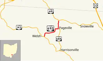 State Route 692 (SR 692) was a short north–south state route in southern Ohio that was located entirely within Meigs County. The southern terminus of SR 692 was at SR 143 approximately three miles (4.8 km) northwest of the hamlet of Harrisonville. Its northern terminus was at SR 681 near the hamlet of Pageville. In 2013, the Ohio Department of Transportation (ODOT) removed SR 692 from the state highway system by making the route north of Pageville an extension of SR 684 and the remainder being transferred to Meigs County's jurisdiction.