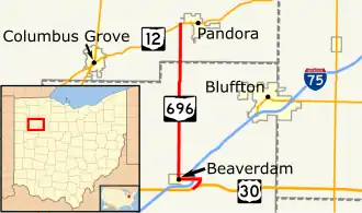 State Route 696 (SR 696, OH 696) is a north–south state route in the western part of the U.S. state of Ohio. State Route 696's southern terminus is at an interchange with the U.S. Route 30 expressway about 1 mile (1.6 km) east of Beaverdam.