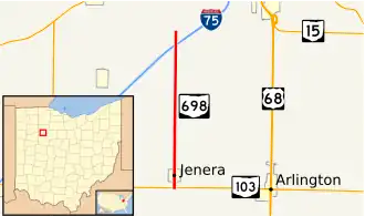 Ohio State Route 698 (OH 698) is a north–south state route in northwestern Ohio. Its southern terminus is at OH 103 near Jenera, and its northern terminus is at Hancock County Road 313 (formerly US 25), which is parallel to I-75, about 5 miles (8.0 km) southwest of Findlay.