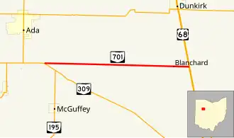 State Route 701 (SR 701, OH 701) is a 8.96-mile (14.42 km) east–west state highway in western Ohio, a U.S. state. The state highway's western terminus is at a T-intersection with SR 309 nearly 3 miles (4.8 km) southeast of Ada. The eastern terminus of State Route 701 is at U.S. Route 68 (US 68) approximately 3.50 miles (5.63 km) southeast of Dunkirk.