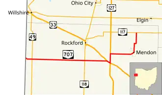 State Route 707 (SR 707) is a 19.45-mile-long (31.30 km) east–west state highway in the western portion of the U.S. state of Ohio. The western terminus of SR 707 is at the Indiana state line approximately 7.50 miles (12.07 km) southwest of Willshire, where it transitions into Indiana State Road 218. The eastern terminus of SR 707 is at SR 117 nearly 3 miles (4.8 km) north of Mendon.