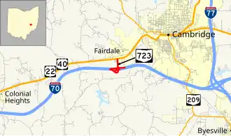 State Route 723 (SR 723) is a very short state highway located in east-central Ohio. Having a length of just 0.85 miles (1.37 km) and located just southwest of Cambridge, the route serves as a connector between Interstate 70 (I-70) at its exit 176 and the concurrency of U.S. Route 22 (US 22) and US 40.