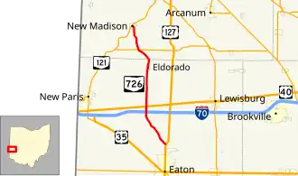 State Route 726 (SR 726) is a north–south state highway in western Ohio, a U.S. state. The southern terminus of the state route is at a T-intersection with US 127 about 1 mile (1.6 km) north of the city limits of Eaton. The northern terminus of SR 726 is at a signalized intersection with SR 121 in downtown New Madison.