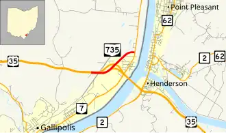 State Route 735 (SR 735) is a short east–west state highway in southeastern Ohio, located just northeast of the county seat of Gallia County, Gallipolis. The highway runs just under 1.25 miles (2.01 km) in length between its western terminus at a partial interchange with U.S. Route 35 (US 35) and its eastern terminus at a signalized T-intersection with SR 7. The route serves solely as a connector from eastbound US 35 to SR 7, and from SR 7 to westbound US 35. An interchange between these two end routes exists nearby, but only allows access from westbound US 35 to SR 7, and from SR 7 to eastbound US 35. SR 735 is a former alignment of US 35 when it traveled on the Silver Bridge to cross the Ohio River to Point Pleasant, West Virginia.