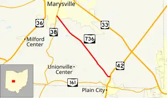 State Route 736 (SR 736, OH 736) is a north–south state highway in the central portion of the U.S. state of Ohio. Its southern terminus is at U.S. Route 42 (US 42) near Plain City, and its northern terminus is at a T-intersection with SR 38 in Marysville.