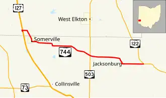 State Route 744 (SR 744) is an east–west state highway in southwestern Ohio, a U.S. state. The western terminus of SR 744 is at its junction with US 127 a distance of 1 mile (1.6 km) northwest of Somerville. The eastern terminus of the state route is at a T-intersection with SR 122 approximately 1.50 miles (2.41 km) east of the village of Jacksonburg.