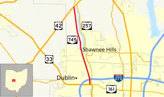 State Route 745 (SR 745) is a state route in central Ohio that runs in a north-northwesterly direction along the west bank of the Scioto River. Its southern terminus is at the concurrency of U.S. Route 33 (US 33) and SR 161 in Dublin, and it runs for approximately ten miles (16 km) to Concord Township in Delaware County, where it arrives at its northern terminus at the concurrency of US 42 and SR 257. SR 745 was designated in 1937, and its routing has not changed since.