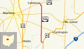 State Route 746 (SR 746) is a north–south thirteen-mile-long (21 km) state highway located in central Ohio, a U.S. state. Its southern terminus is at U.S. Route 42 (US 42) approximately three miles (4.8 km) north of Ashley, and its northern terminus is at SR 309 in Caledonia.