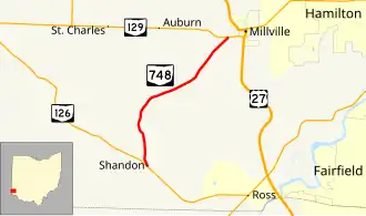 SR 748 commences at its junction with SR 126 in the hamlet of Shandon. Starting out in a northwesterly direction, the highway passes through a residential neighborhood. Bending to the north, the highway enters into rural Morgan Township. The majority of SR 748 passes amid farmland, with the occasional patch of trees and numerous houses lining the roadway. After traveling due north, the highway bends to the northwest, meets Bell Road, then bends back to the north. SR 748 next bends to the northeast and then east-northeast, as it crosses Morgan-Ross Road, and into Ross Township. Following intersections with Kirchling Road and Layhigh Road, the state route bends back to the northeast, and crosses Fenton Road. The highway passes a number of houses prior to arriving at its endpoint at a T-intersection with SR 129 approximately one-half mile (0.80 km) of U.S. Route 27 and the village of Millville.[3]