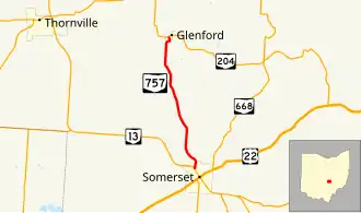 State Route 757 (SR 757) is a north–south state highway located in the central portion of the U.S. state of Ohio. The highway runs from its southern terminus at SR 13 in Somerset to its northern terminus at a T-intersection with SR 204 in Glenford.