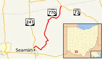 State Route 770 (SR 770, OH 770) is a north–south state highway in the southern portion of the U.S. state of Ohio. The southern terminus of State Route 770 is at State Route 247 in Seaman. Its northern terminus is at its junction with State Route 73 about 10.5 miles (16.9 km) north of Seaman, just inside of the Adams-Highland County Line.