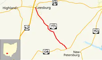 State Route 771 (SR 771) is a 7.11-mile-long (11.44 km) state highway located entirely in Highland County, Ohio. The north–south route connects SR 138 in Paint Township and SR 28 in Leesburg.