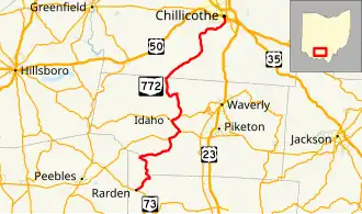 State Route 772 (SR 772) is a north–south state highway in the south-central portion of the U.S. state of Ohio. Its southern terminus is at SR 73 in Rarden. Leaving Rarden, the route increases in elevation to Mount Joy, the highest point in Scioto County. After weaving between Scioto and Pike County for about four miles (6.4 km), the route joins the Appalachian Highway, SR 32 and subsequently SR 124. Following these concurrences, SR 772 continues its journey north through scenic terrain and small communities until it reaches its northern terminus at the US 50 and SR 104 concurrence in Chillicothe.[2]