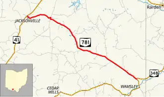 State Route 781 (SR 781) is an east–west state highway in southern Ohio, a U.S. state. The western terminus of SR 781 is at SR 41 about 2+1⁄2 miles (4.0 km) southwest of Peebles in the unincorporated community of Jacksonville. Its eastern terminus is eleven miles (18 km) to the southeast at a T-intersection with SR 348, which is approximately five miles (8.0 km) northeast of the community of Wamsley.