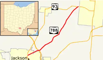 State Route 788 (SR 788) is a north–south state highway in the southern portion of the U.S. state of Ohio. The western terminus is at State Route 93 in Jackson. Its eastern terminus is also at State Route 93, this time less than 2 miles (3.2 km) west of Wellston.