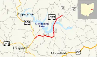 SR 799 begins at a T-intersection with SR 800 in Washington Township 1.25 miles (2.01 km) northeast of Freeport. From this point, passing first amidst some open fields before entering into a more forested terrain, with the occasional house appearing along the way, SR 799 roughly parallels the Clendening Lake shoreline about one-quarter mile (0.40 km) to the south, in the process entering Nottingham Township, dipping briefly into Moorefield Township before turning north, re-entering Nottingham Township, and then following Clendening Lake's eastern edge. SR 799 crosses small bays formed by the lake twice, and comes to an end at its intersection with CR 60 (Redeye Road) just past the lake's northernmost extent. The road continues another three miles (4.8 km) north to Deersville as CR 21 (Mallarnee Road).[6]