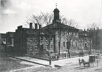 On February 14, 1812, the General Assembly created a new capital city on the "High Banks opposite Franklinton at the Forks of the Scioto most known as Wolf's Ridge".[9] Approximately a week later, after intense debate, the legislature selected Columbus as the name of the new town.[6][10] In the following months the new town was surveyed and laid out in rectangular grid.[10] The layout set aside two 10-acre parcels of land, one for a statehouse, at the location of the present day Statehouse, and the other parcel would become the site of the Ohio Penitentiary.[6][10] Public sale of town lots for the new city began in June 1812.[6] In 1816, the General Assembly met in Columbus for the first time in a brick building on the corner of High and State Streets.[6]