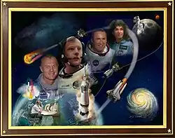 Ohioans in Space is an oil painting by William D. Hinsch that pays homage to Ohio-born astronauts, including John Glenn, Neil Armstrong, Jim Lovell, Judith Resnik, and Gene Kranz.[14] It was commissioned by the Capitol Square Review and Advisory Board to honor achievements of Ohioans in space exploration. It is installed in the statehouse rotunda.[15] It is the first painting installed in the statehouse rotunda in almost 70 years, since the painting of the Wright brothers was hung.[16] It portrays four of Ohio's 26 astronauts, selected for their groundbreaking accomplishments: John Glenn, the first American to orbit Earth; Neil Armstrong who, on Apollo 11, became the first individual to set foot on the Moon; James Jim Lovell, the first astronaut to undertake four spaceflights, including Apollo 8 (the first humans to reach and orbit the Moon) and Apollo 13; and Judith Judy Resnik, one of the pioneering women selected by NASA for spaceflight missions.[17] The painting also features Gene Kranz, a NASA flight director from Toledo, Ohio. Gene Kranz represents all the people involved in making the space flight possible.[18]