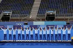 ![]() Argentina women's hockey team (silver) at the medal ceremony, the stands of the Oi Hockey Stadium in the background | |