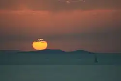 One of the most popular attractions in the town is sunset viewing. It is a special event every evening in Oia from the Sunset Seranade point. At this time the town is crowded with people to watch the spectacle, when the white houses and the caldera catch all the colours of the setting sun for a few seconds.[6]