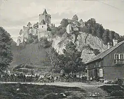 Ojców Castle (Polish: Zamek Ojców) - a castle located in the Kraków-Częstochowa Upland, part of a system of castles known as the Eagle's Nests (Polish: Orle Gniazda) - formerly protecting the southern border of the Kingdom of Poland; currently housing a museum dedicated to the castle in its renovated castle-tower. The castle is located in the village of Ojców (25 kilometres (16 mi) north of Kraków), Lesser Poland Voivodeship; in Poland.[1]