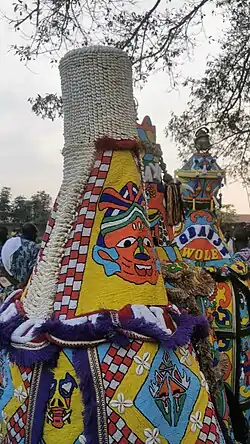 They also organize carnivals where colorful elaborate masquerades are displayed to the gleeful view of thousands who participate in call and response musical compositions, while society members wear group uniforms based on chosen fabric and styles with walking sticks called Ashobi (Aso-Ebi).[11]
