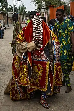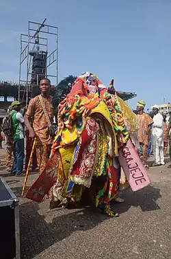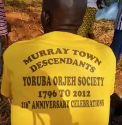The Ojeh, Oje or Egungun society[1][4] Yoruba: Ọjẹ (Ɔjɛ), Egúngún, is a fraternal institution in the West African countries of Sierra Leone and The Gambia. The society emerged from within the ranks of liberated Africans in the surrounding villages on the Freetown peninsula such as Hastings, Waterloo, Aberdeen and Murray Town of the Sierra Leone colony and subsequently, in Freetown during the mid 19th century.[5] By the mid 1800's, there were nearly 60,000 of these Yoruba people in Freetown known by the collective name Aku.[6] It is a part of the larger Egungun tradition, and the name of the group itself is the customary appellation of the society of those who are members of the Egungun cult in Yorubaland, who are called Ọlọjẹs.