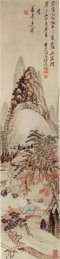 Okada Beisanjin was a notable bunjinga painters. The Japanese term bunjinga refers to a style of painting produced by literati (bunjin). Bunjinga traces its roots to the paintings of Chinese literati of the Song dynasty (960–1267).While Beisanjin employed a variety of styles in his paintings, his later works are characterized by forceful brushstrokes that create unusual forms and give texture to his images.[2]
