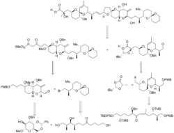 In Isobe's synthesis, the molecule was broken into three pieces, along the C14–C15 bonds, and the C27–C28 bonds. This formed fragments A, B, and C, which were all synthesized separately, after which the B and C fragments were combined, and then combined with the A fragment. This synthesis contained 106 steps, with a longest linear sequence of 54 steps. The precursors to all three fragments were all glucose derivatives obtained from the chiral pool. Spiroketals were obtained from precursor ketone diols, and were therefore formed thermally in acid.[5][13][16]